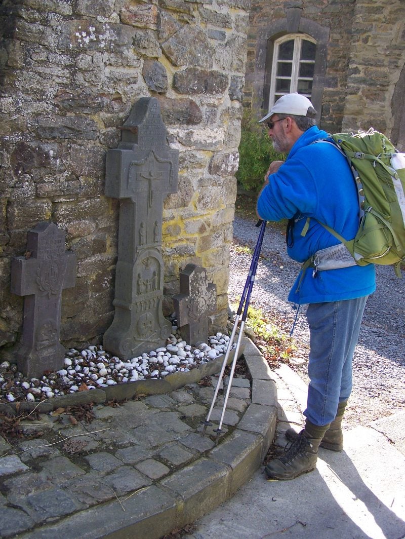 Zaterdag 30 oktober,na een prima ontbijt om klokslag 8 uur ( eerder kon niet, de bakker komt pas om 8 uur!) lopen we om 8.50 uur weer de 1.5.km terug om de route weer op te pakken. Er staat vandaag veel wind en het begin is asfalt met daarna gelukkig weer bospaden met als afsluiting een lange dalende asfaltweg tussen weilanden door naar Burg-Reuland. Meteen bij het eerste cafe koffie gedronken, daarna een rondje burchtruïne en het mooie kerkje van binnen bekeken. Kopen brood bij de bakker en daarna is het klimmen geblazen om Burg Reuland uit te komen. We komen bij een pad met houten kruizen waar een splitsing is van GR5 en GR56......gelukkig letten we goed op en nemen het juiste pad nog verder omhoog. Op de top willen we eten , er staat een bankje en kruisbeeld, echter ook veel wind! Gelukkig liggen er 25 meter verder veel strobalen in plastic, daar zitten we uit de wind....! Verder weer door de bossen en langs bomen vol prachtige herfstkleuren. We lopen door de mooie vallei van de Federbach en langs een stukje grens België /Luxemburg. Jammer het gaat regenen dus even schuilen in een bushokje. Gelukkig maar een klein buitje toch genoeg om de paden modderig te maken. Tot onze verbazing loopt de GR5 over het kerkhofje van OUREN. Hier hebben we een hotel besproken dat echter geen "ster" verdient.....! Maar goed, we hebben onderdak....! Ouren is een toeristisch plaatsje en de hotels zijn dikwijls allemaal vol dus dan neem je toch wat nog over is! We hebben vandaag weer 22 kilometer gelopen.