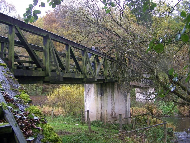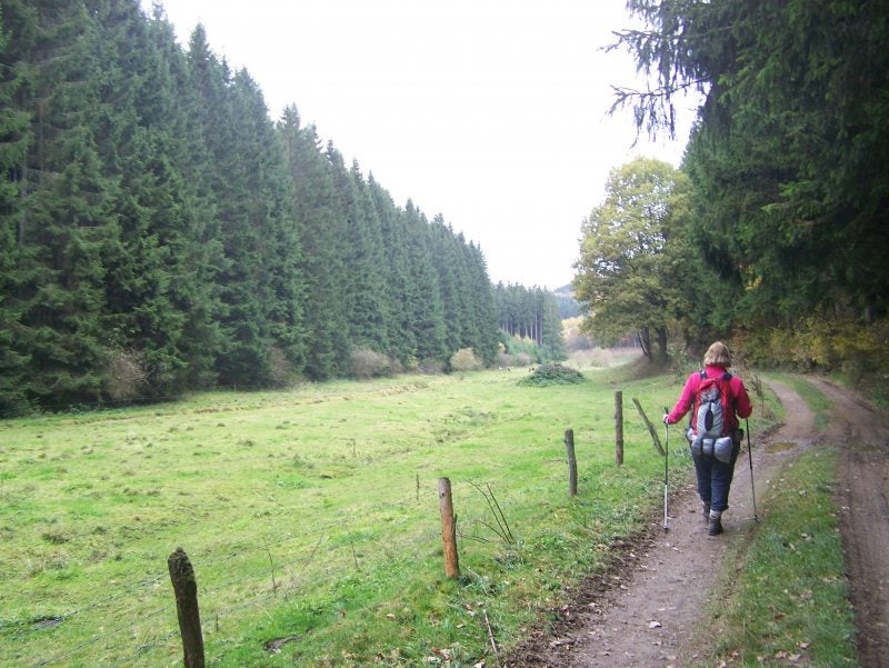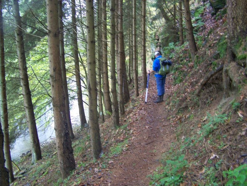 Vrijdag 29 oktober, na een goed ontbijt en brood te hebben gekocht lopen we om 9 uur Vielsalm uit. Het is heerlijk herfstweer en een mooi pad als we het stadje achter ons hebben gelaten. We komen Ruisseau des Fagnes tegen, een wad dat dikwijls vol water staat, nu echter kunnen we er met een hink-stap-sprong overheen. We horen de kettingzagen van de bomen die omgedaan worden, het is niet ver vanaf het pad dat we lopen dus drinken we koffie zittend op een boomstam en kijken naar het strippen van de stammen, het ruikt er heerlijk! Het is een afwisselende route, langs nieuwsgierige koeien, door gehuchtjes, bospaadjes en wildstromende beekjes komen we bij de drukke weg (N 62) waar we 1.5.km langs lopen om bij het Aparthotel te komen waar we een kamer hebben gereserveerd incl.diner en ontbijt. Het hoort bij camping Hohenbusch. SCHRIM/Grufflingen. We hebben een heel apartement voor 4 personen tot onze beschikking! Een beetje oubollig maar heel netjes. Als we gaan eten in de kantine van de camping zijn we de enigste, heerlijk rustig en het eten is prima! Op tijd naar bed, hebben 22 km gelopen !!