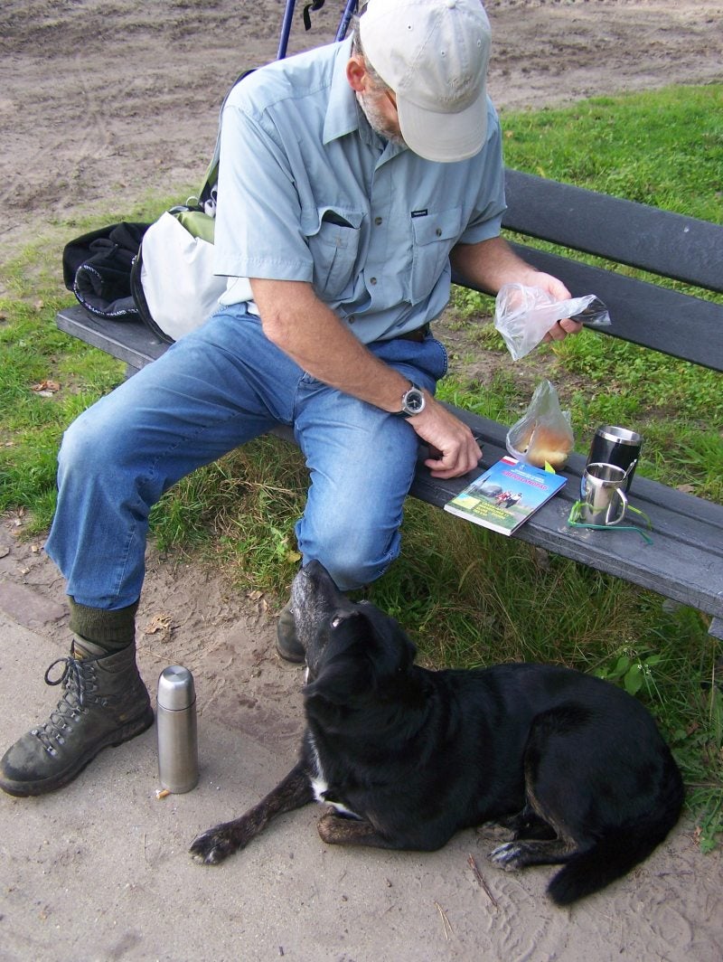 We lopen een heel eind weer pal langs de grens en wel over de : Grensstraat, hoe toepasselijk. Het gaat erg hard waaien en we zien nergens een goed plekje om te eten , bij een boerderij staan wat plastic stoelen buiten en daar mogen we, uit de wind, ons brood opeten!